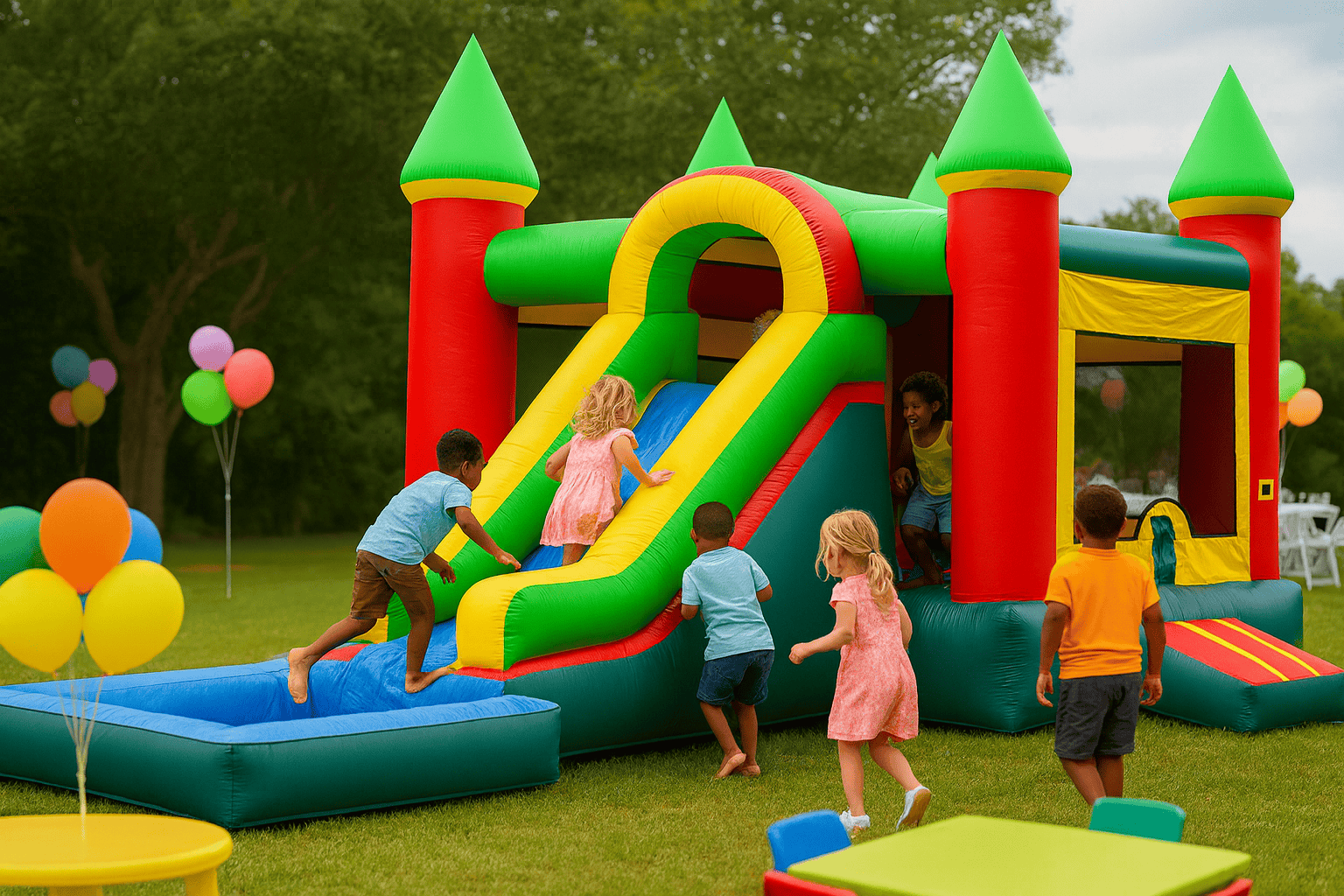 Take your party to the next level with our Castle Combo Bounce House, featuring a built-in slide and splash pool for double the fun! This vibrant inflatable is perfect for keeping kids entertained for hours at birthday parties, backyard celebrations, school events, or summer gatherings.